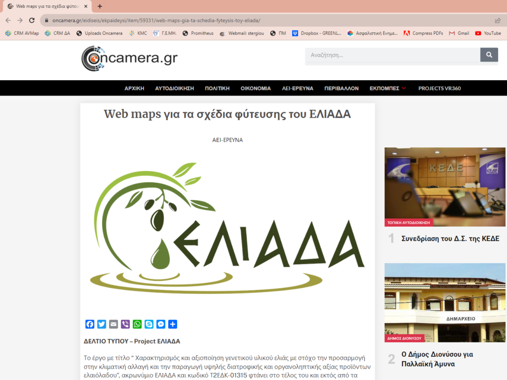 Το έργο με τίτλο “ Χαρακτηρισμός και αξιοποίηση γενετικού υλικού ελιάς με στόχο την προσαρμογή στην κλιματική αλλαγή και την παραγωγή υψηλής διατροφικής και οργανοληπτικής αξίας προϊόντων ελαιόλαδου”, ακρωνύμιο ΕΛΙΑΔΑ και κωδικό Τ2ΕΔΚ-01315 φτάνει στο τέλος του και εκτός από τα εξαιρετικά ερευνητικά αποτελέσματα για την προστασία του γενετικού υλικού ελιάς, αναπτύχθηκαν και γεωπληροφορικές εφαρμογές. Η εταιρία AVMap GIS A.E., σε συνεργασία με το Τμήμα Γενετικής Βιοτεχνολογίας Οπωροκηπευτικών του Μεσογειακού Αγρονομικού Ινστιτούτου Χανίων και το ελαιουργείο Μάρακας Μιχαήλ, αποτύπωσε σε διαδικτυακούς χάρτες τα σχέδια φυτεύσεων του έργου. Πρόκειται για μια διαδικτυακή πλατφόρμα που έχει αναπτύξει η AVMap GIS A.E., ανοικτής αρχιτεκτονικής και με χρήση αποκλειστικά open-source λογισμικού, με την οποία είναι δυνατή η εμφάνιση δεδομένων που ως σήμερα μπορούσαν να προβληθούν μόνο σε desktop GIS λόγω του όγκου και της πολυπλοκότητάς τους, σε περιβάλλον Web.