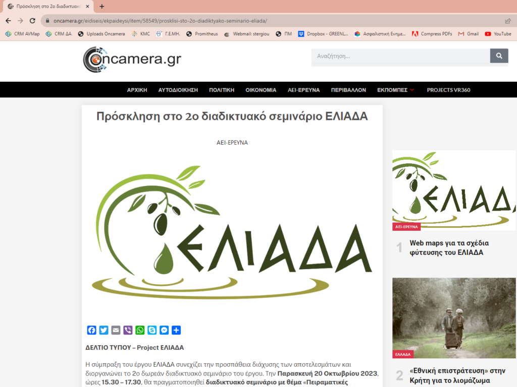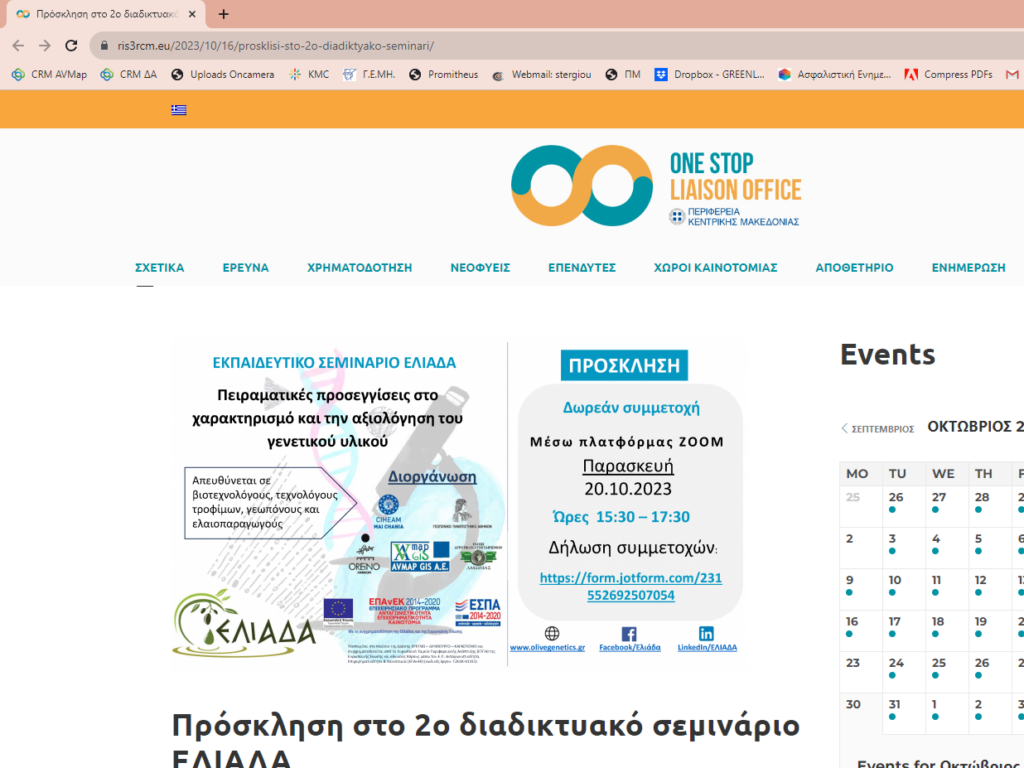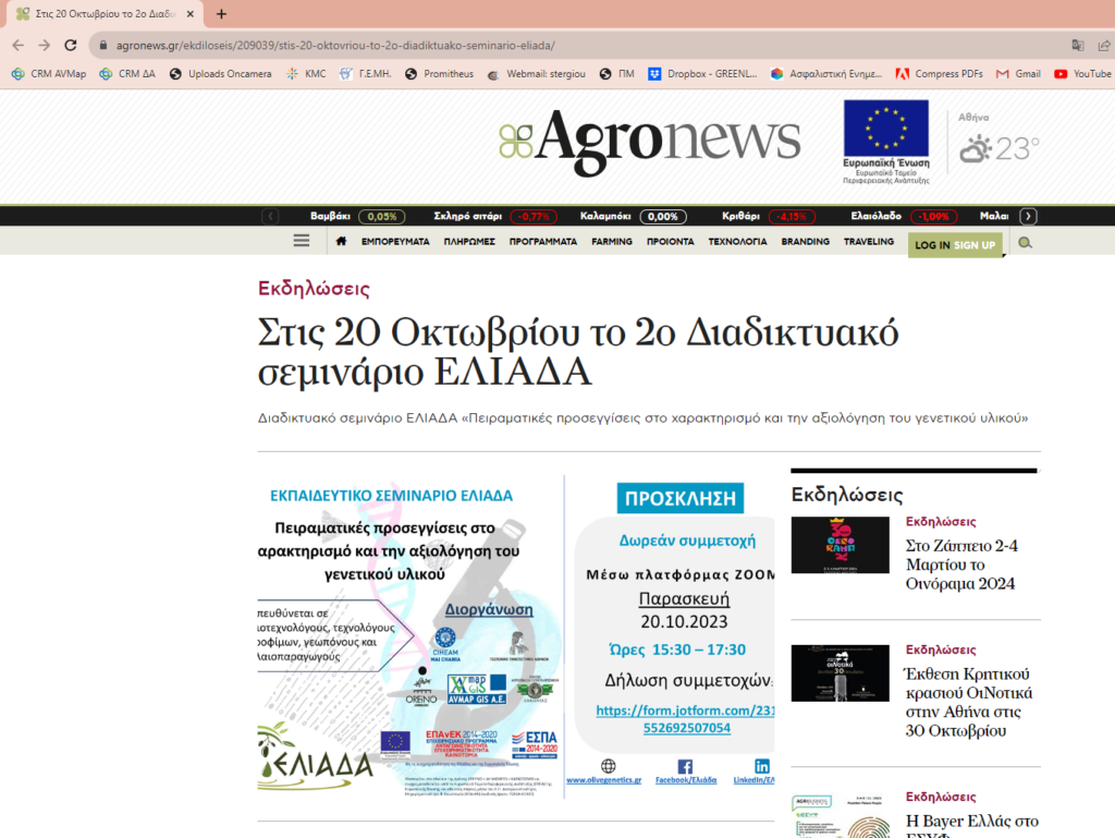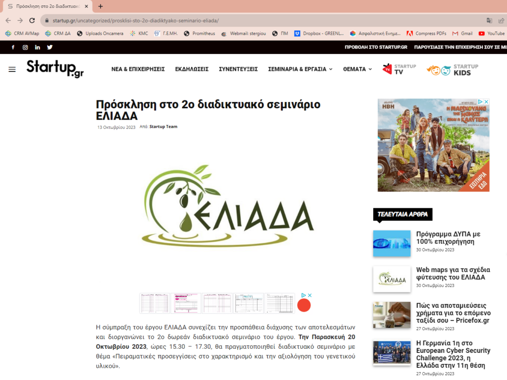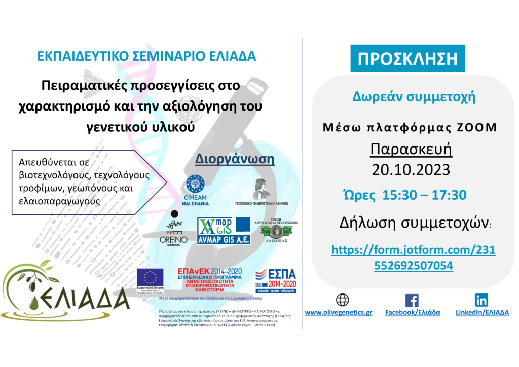 Η σύμπραξη του έργου ΕΛΙΑΔΑ συνεχίζει την προσπάθεια διάχυσης των αποτελεσμάτων και διοργανώνει το 2ο δωρεάν διαδικτυακό σεμινάριο του έργου. Την Παρασκευή 20 Οκτωβρίου 2023, ώρες 15.30-17.30, θα πραγματοποιηθεί διαδικτυακό σεμινάριο με θέμα «Πειραματικές προσεγγίσεις στο χαρακτηρισμό και την αξιολόγηση του γενετικού υλικού».