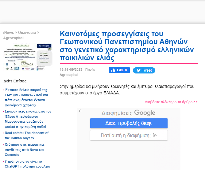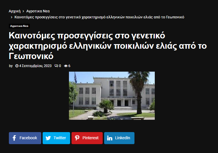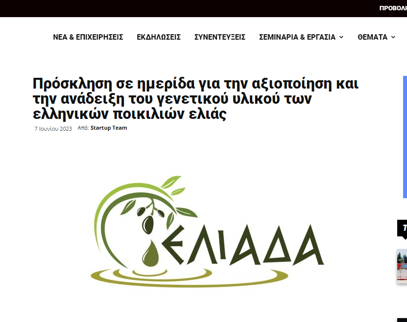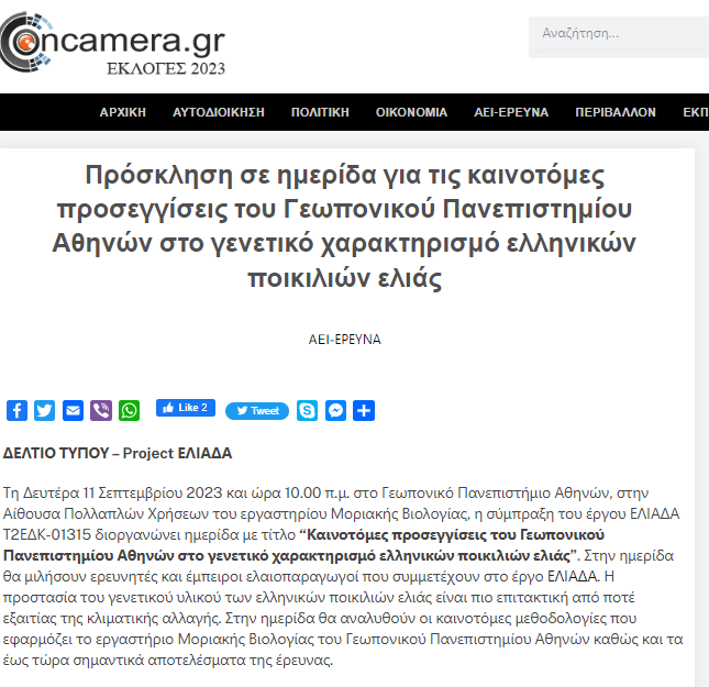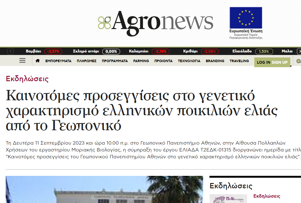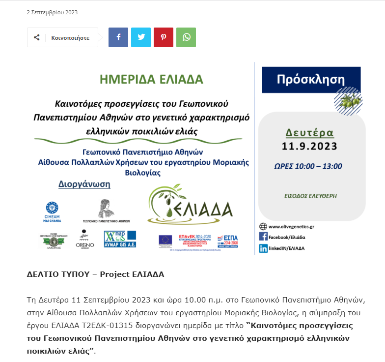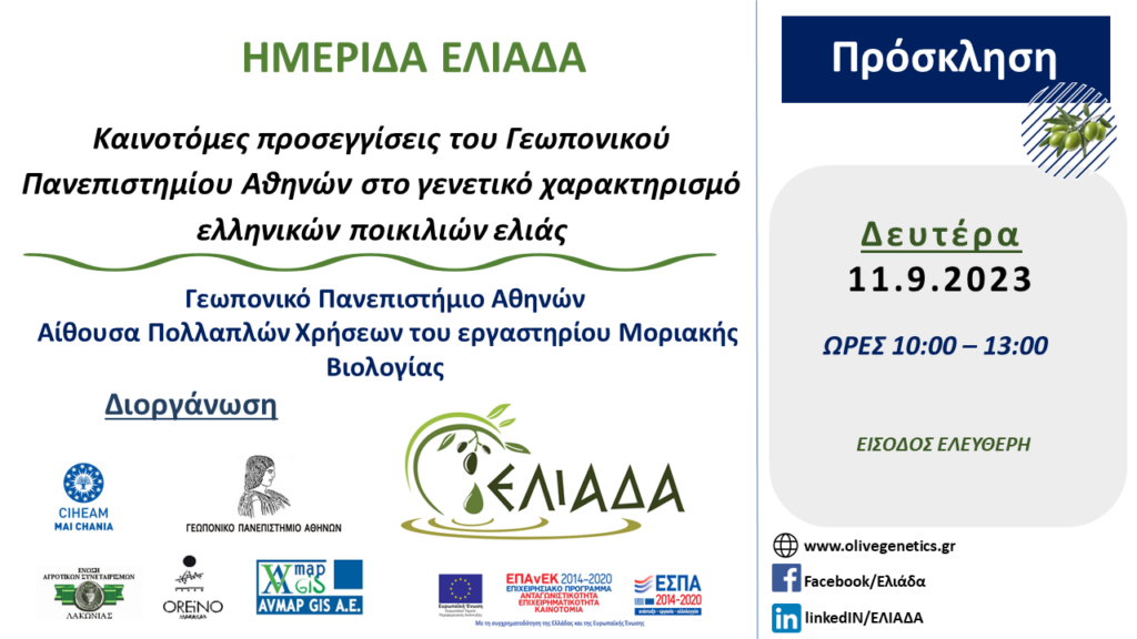 Τη Δευτέρα 11 Σεπτεμβρίου 2023 και ώρα 10.00 στο Γεωπονικό Πανεπιστήμιο Αθηνών, στην Αίθουσα Πολλαπλών Χρήσεων του εργαστηρίου Μοριακής Βιολογίας, η σύμπραξη του έργου ΕΛΙΑΔΑ Τ2ΕΔΚ-0315 διοργανώνει ημερίδα με τίτλο ‘’Καινοτόμες προσεγγίσεις του Γεωπονικού Πανεπιστημίου Αθηνών στο γενετικό χαρακτηρισμό ελληνικών ποικιλιών ελιάς’’. Στην ημερίδα θα μιλήσουν ερευνητές και έμπειροι ελαιοπαραγωγοί που συμμετέχουν στο έργο ΕΛΙΑΔΑ. Η προστασία του γενετικού υλικού των ελληνικών ποικιλιών ελιάς είναι πιο επιτακτική από ποτέ εξαιτίας της κλιματικής αλλαγής. Στην ημερίδα θα αναλυθούν οι καινοτόμες μεθοδολογίες που εφαρμόζει το εργαστήριο Μοριακής Βιολογίας του Γεωπονικού Πανεπιστημίου Αθηνών καθώς και τα έως τώρα σημαντικά αποτελέσματα της έρευνας.