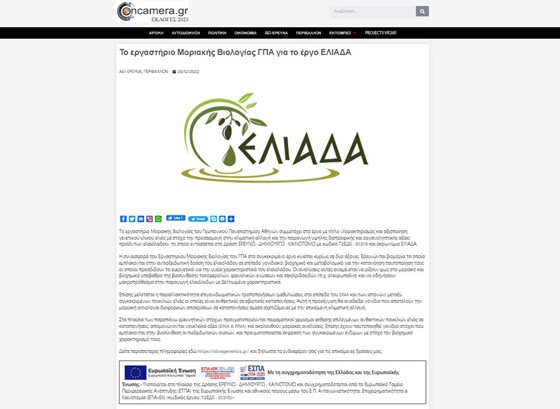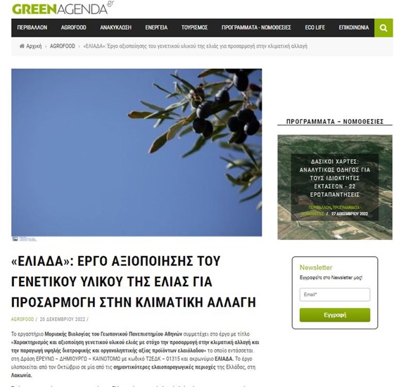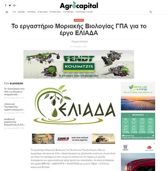 Το εργαστήριο Μοριακής Βιολογίας του Γεωπονικού Πανεπιστημίου Αθηνών συμμετέχει στο έργο με τίτλο «Χαρακτηρισμός και αξιοποίηση γενετικού υλικού ελιάς με στόχο την προσαρμογή στην κλιματική αλλαγή και την παραγωγή υψηλής διατροφικής και οργανοληπτικής αξίας προϊόντων ελαιόλαδου» το οποίο εντάσσεται στη Δράση ΕΡΕΥΝΩ – ΔΗΜΙΟΥΡΓΩ – ΚΑΙΝΟΤΟΜΩ με κωδικό Τ2ΕΔΚ – 01315 και ακρωνύμιο ΕΛΙΑΔΑ.